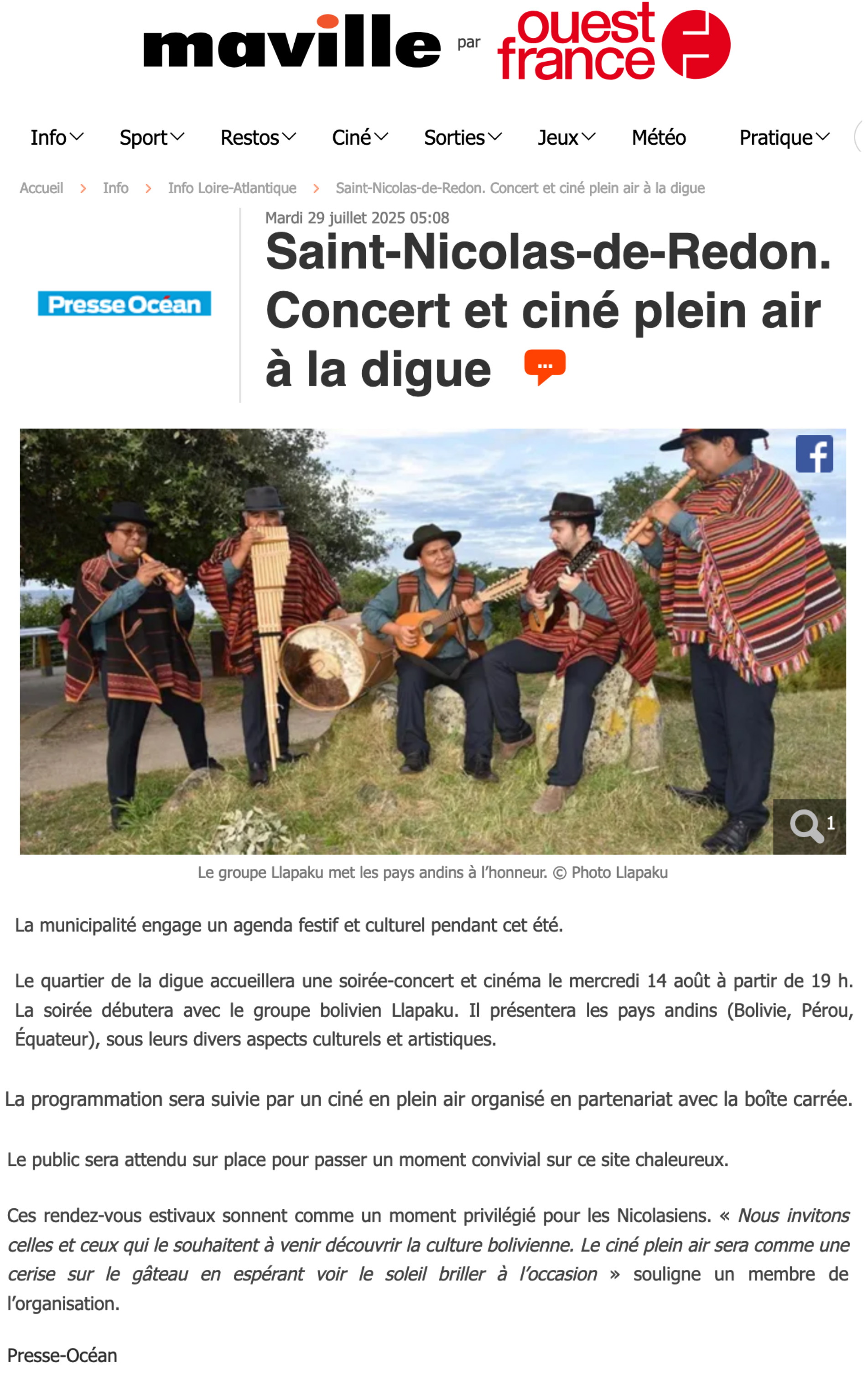 Les six membres de l'association "Sourires bolivianos", ont organisé leur premier concert en invitant le groupe "Llapaku" de Rennes. Des musiques de Bolivie, Pérou et d'Equateur ont été proposés ainsi que des chants en Quechua et Aymara. Les instruments sont fabriqués par les musiciens eux mêmes, avec des roseaux. Le temps d'une soirée le dépaysement fut total et la musique apaisante. Llapaku se déplace dans toute la France pour faire découvrir la musique des Andes.