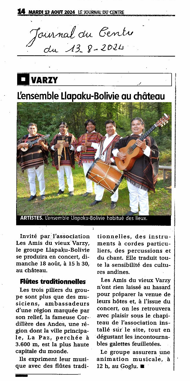 Le groupe LLAPAKU, quatre musiciens boliviens, costumés et aux instruments d'Amérique du sud sont sur scène, dimanche, à la Kermesse, pour donner le meilleur du folklore traditionnel des Andes. Ce groupe a été proposé par Elisabeth Pellicot et son association Art clé en main. Cet ensemble coloré, aux musiques traditionnelles soutenues par la célèbre flûte indienne, nous fait pénétrer en Amérique du Sud au centre d'une des civilisations les plus anciens et les plus riches.